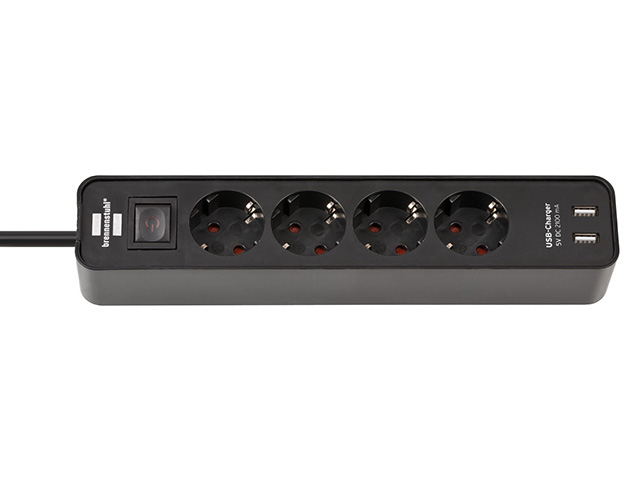 Удлинитель 1.5м (4 роз., 3.3кВт, с/з, 2 USB порта, выкл., ПВС) черный Brennenstuhl Eco-Line (провод 3х1,5мм2, сила тока 16А, 2 USB порта, с/з - с зазе