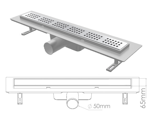Сливной трап горизонтальный D 50, решетка нерж.с площадкой под плитку, 65х600мм, квадрат, NOVA
