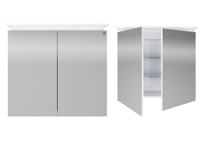 Зеркальный шкаф с двумя дверцами на петлях с доводчиками, интегрированная подсветка, 2 полки. Цвет боковин - белый. Корпус/фасад в краске.