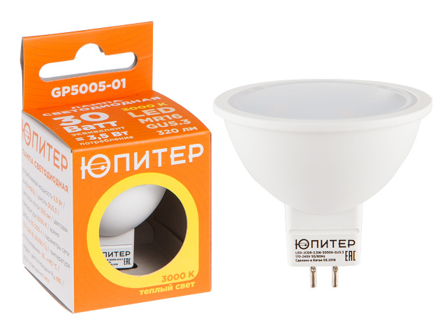 Лампа светодиодная JCDR 3.5 Вт 170-240В GU5.3 3000К ЮПИТЕР (30 Вт аналог лампы накал., 320Лм, теплый белый свет)