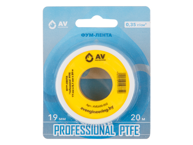 Фум-лента Professional PTFE 19мм х 0,1мм х 20м в блистере, AV Engineering