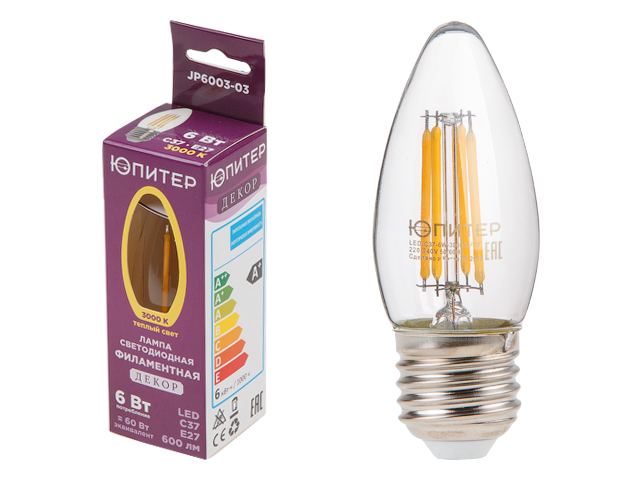 Лампа светодиодная филаментная C37 СВЕЧА 6 Вт E27 3000К ЮПИТЕР ДЕКОР (60 Вт аналог лампы накал., 560Лм)