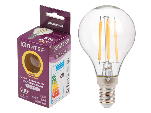 Лампа светодиодная филаментная G45 ШАР 6 Вт E14 3000К ЮПИТЕР ДЕКОР (60 Вт аналог лампы накал., 600Лм)