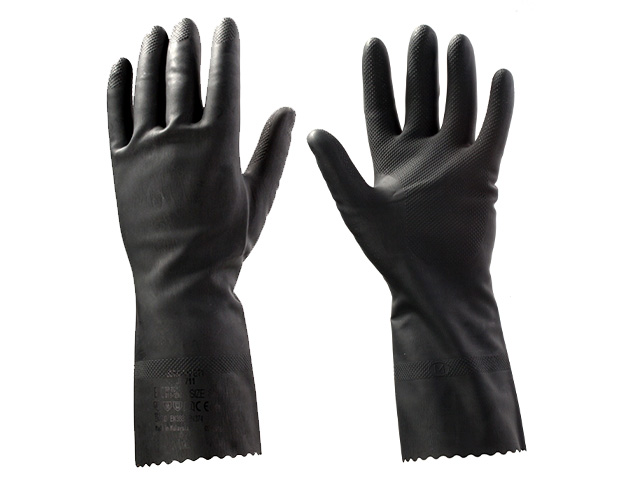 Перчатки изготовлены из 100% натурального латекса, обладают высокой устойчивостью к водорастворимым неорганическим кислотам (до 50%) и щелочам (до 40%). Применение: хозяйственно-бытовые работы, общепромышленное использование. Гипоаллергенное х/б напыление внутри перчатки препятствует раздражению кожи рук. Имеют рельефную поверхность ладони, что обеспечивает удобный захват.Аналог перчаток КЩС