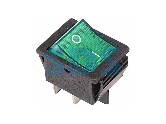Выключатель клавишный 250V 16А (4с) ON-OFF зеленый с подсветкой предназначен для коммутации электрических цепей переменного тока напряжением до 250В. Клавишные (Рокерные) выключатели применяются в качестве комплектующих изделий различного электрооборудования (в сетевых фильтрах и удлинителях, аудио-оборудовании, блоках питания, электроустановках на различных производствах, автомобилях, и многих других местах). Такой клавишный переключатель имеет два положения. Принцип действия основан на перемещении клавиши в одну из позиций. Для переключения в нужное положение требуется приложить некоторые усилия на клавишу. Монтаж осуществляется без применения винтов на плоских панелях толщиной от 0.8мм до 3мм. Подключение контактов осуществляется плоской клеммой 6.6мм, либо с помощью пайки.