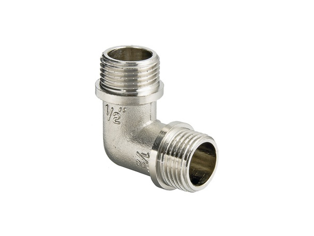 Угловой латунный никелированный фитинг. Резьба - наружная/наружная, цилиндрическая трубная по ГОСТу 6357 (ISO 228, EN 10226).