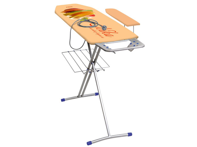 Четырехопорные металлические ножки с пластмассовыми наконечниками сохраняют надежную устойчивость доски и не царапают поверхность пола.Конструкция имеет двухступенчатую регулировку высоты. Чехол сшит из качественной хлопковой ткани, не желтеет и не линяет. В модели также есть съемный подрукавник для удобства глажения рукавов и дополнительная полка для белья.