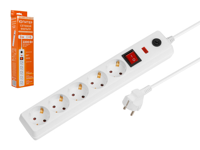 Фильтр сетевой 3м (5 роз., 2,2кВт, с/з, выкл, ПВС 3х0,75) белый Юпитер (ЮПИТЕР)