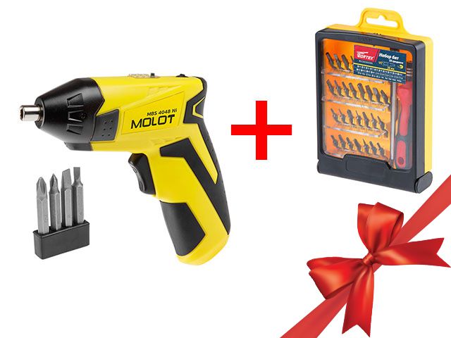 Аккум. шуруповерт MOLOT MBS 4048 Ni в блистере+ набор бит + АКЦИЯ (набор бит Wortex в подарок!) (набор бит 33 пр. Wortex в подарок!)