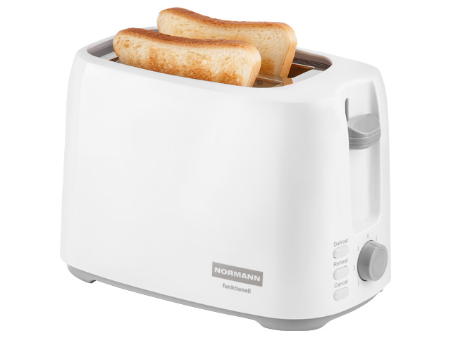 Функциональный тостер на 2 ломтика хлеба NORMANN Funktionell обладает всеми самыми необходимыми функциями для поджарки румяных тостов, такими как регулировка степени обжарки, подогрева и разморозки, функции досрочной отмены приготовления. Автоматическая центровка тостов позволяет равномерно прожарить тост любой толщины.