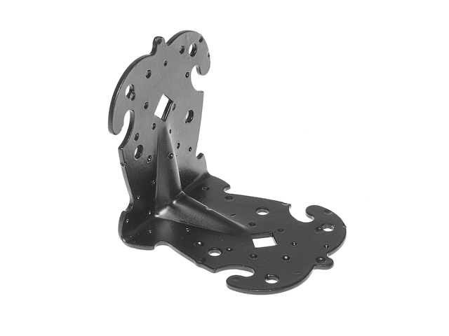 Уголок фигурный представляет собой металлическую пластину, согнутую под углом 90 градусов, со сторонами одинаковой длины. Дополнительная штамповка увеличивает жеcткость уголка и допустимую нагрузку. Имеет монтажные отверстия нескольких типов. Получил универсальное применение, когда элементы конструкции необходимо скрепить под углом 90 градусов. Широко используется при соединении перекрытий, стоек и других деталей из древесины и древесно-стружечных плит.