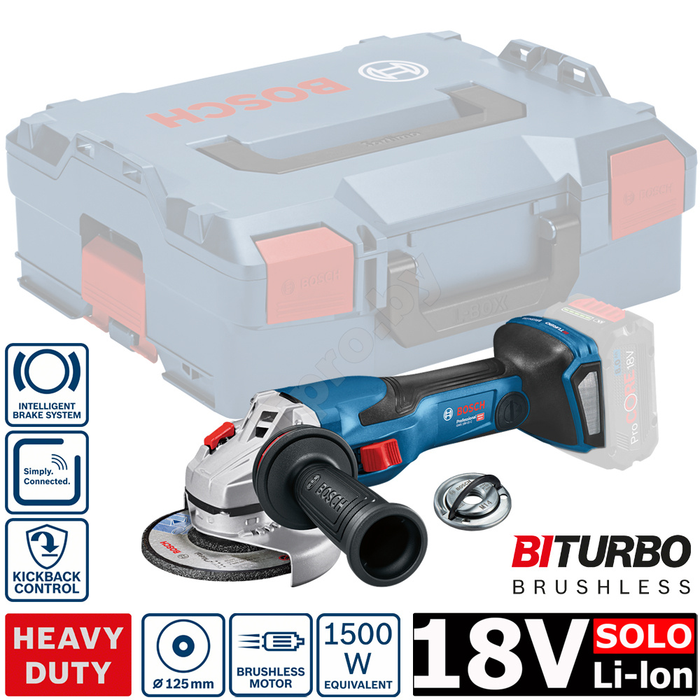 ВЕРСИЯ БЕЗ АККУМУЛЯТОРОВ! GWS 18V-15 C Professional - высокопроизводительная аккумуляторная шлифмашина Bosch с мощностью промышленного оборудования в категории 18В инструментов. Аккумуляторная угловая шлифмашина эквивалентна сетевому инструменту мощностью 1500 Вт, благодаря мощному бесщеточному двигателю, полностью оптимизированному для аккумуляторов ProCORE18V. Инструмент может быть оснащен дополнительным модулем Bluetooth Connectivity. Полный контроль инструмента благодаря функциям KickBack Control и Drop Control. В комплектации с дополнительной рукояткой, защитным кожухом, быстрозажимным фланцем, L-Boxx