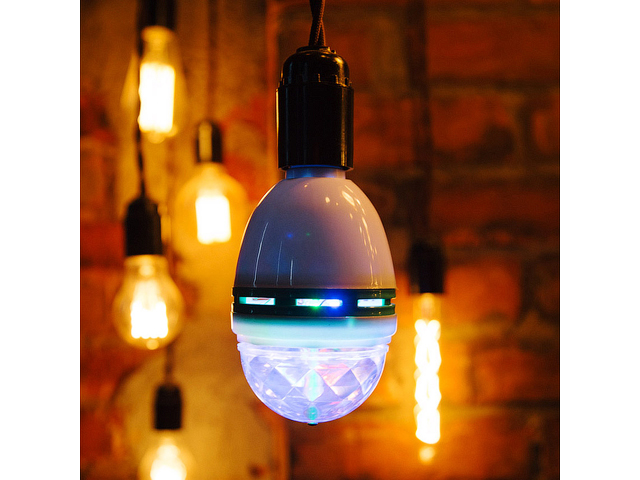 Светодиодная диско-лампа с цоколем E27 - это повод устроить веселую вечеринку прямо у вас дома, не дожидаясь особого повода. Изделие внешне напоминает привычную лампочку, которую можно вкрутить в люстру, бра, торшер или использовать специальную поставку с электрическим кабелем и штепсельной вилкой. Внутри находится моторчик, который приводит в движение купол. Устройство создает эффект светомузыки, отбрасывая разноцветные блики на окружающие предметы. Диско-лампа с тремя светодиодами предназначена для использования в помещениях с умеренной влажностью.