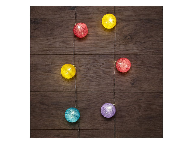 Тайские фонарики <Фейерверк> - эффектная светодиодная гирлянда со степенью защиты IP20 в необычном исполнении. 10 диодов находятся внутри круглых фонариков из хлопковой нити, купол которых мягко рассеивает яркий поток, создавая атмосферу комфорта и уюта. Текстильные декоративные элементы красного, голубого, фиолетового и желтого цветов станут стильным украшением детской, спальни, фотозоны даже в выключенном состоянии. Гирлянда питается от трех элементов типа АА и может использоваться в качестве ночного освещения в спальнях, детских комнатах.