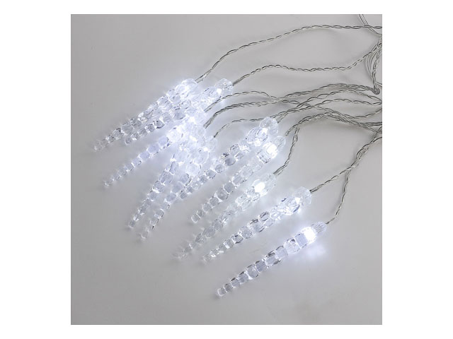 Гирлянда <Сосульки> длиной 1,5 метра, выполнена в виде ассиметричных нитей: на проводе-основе находятся 10 вертикальных отрезков по 20 и 25 сантиметров, на которых размещены 10 ярких диодов белого свечения. Электрический кабель защищен от повреждений слоем эластичной изоляции из прозрачного ПВХ. 10 насадок в виде сосулек эффектно подсвечиваются диодами, имитируя сверкание настоящего льда. Для подключения к электрической сети не понадобится удлинитель: собственная длина питающего шнура составляет 3 метра.