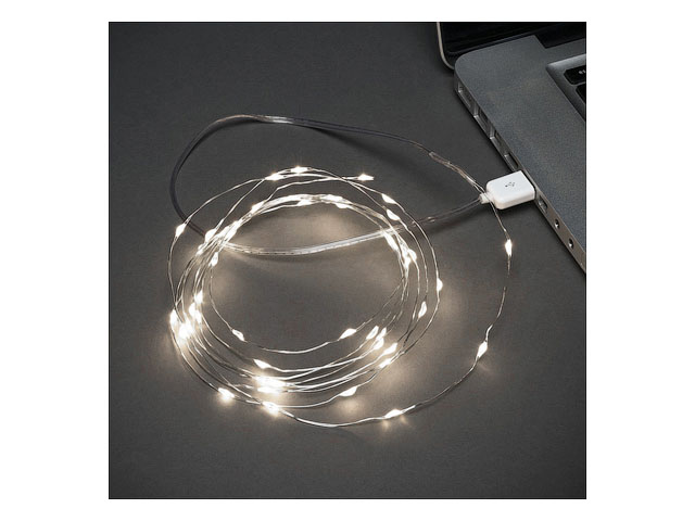 Гирлянда состоит из тонкого провода длиной 5 метров, с расположенными на нем 50 белыми долговечными светодиодами.