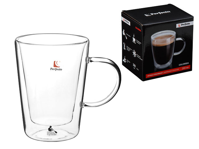 Кружка стеклянная с двойными стенками, 280 мл, серия COLOMBIA, PERFECTO LINEA (Стеклянная кружка ручной работы из боросиликатного стекла)