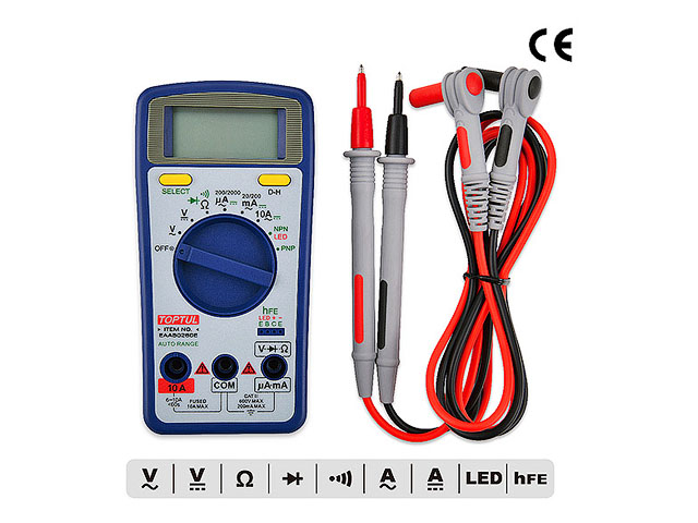 Мультиметр позволяет измерять постоянный и переменный ток, импульсную частоту (40-400Гц), сопротивление (Ом). Данные теста выводятся на удобный цифровой дисплей с функцией автоматического отключения, если прибор ранее не был выключен, для экономии заряда батареи. Мультиметр имеет функцию <прозвонки> со звуковым оповещением, что позволит точно выполнить работу, и ориентироваться в показаниях качественнее и быстрее.