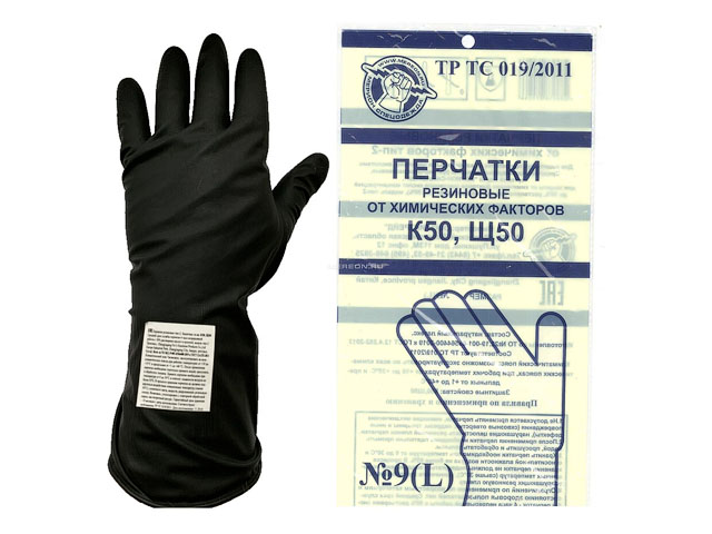 Перчатки резиновые предназначены для защиты рук при работах с 50% растворами кислот и щелочей.