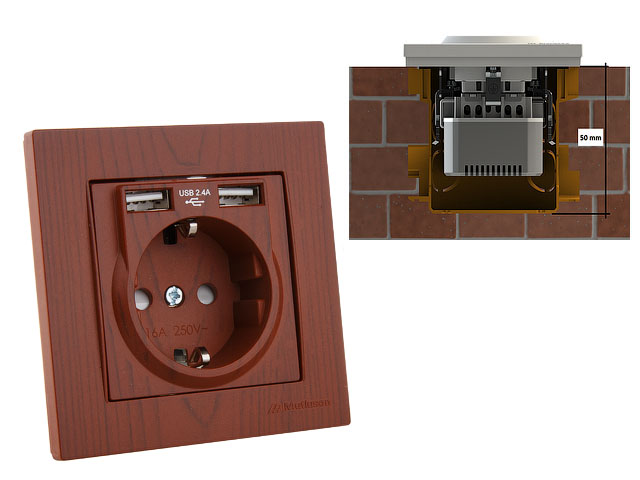 Розетка 1-ая (скрытая, с/з) + 2 USB вишня, RITA, MUTLUSAN