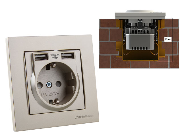 Розетка 16 А 250 В со встроенным зарядным устройством на 2 USB.