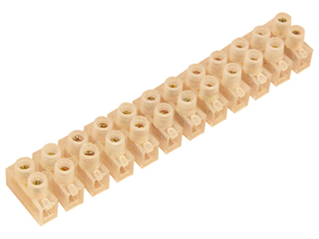 Соединение осуществляется с помощью медных контактов. Кабели и провода фиксируются винтовым зажимом. Клеммная колодка изготовлена из полупрозрачного полиэтилена.