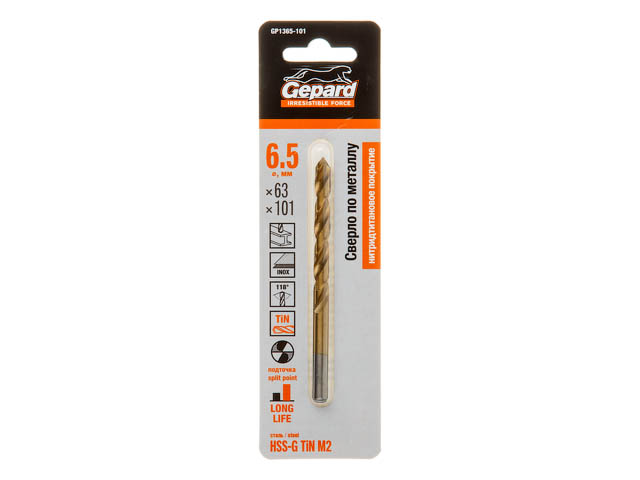 Сверло по металлу ц/х 6.5х63х101 мм HSS TIN GEPARD (нитридтитановое покрытие)
