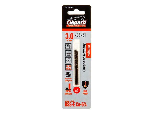 Сверло по металлу ц/х 3.0х33х61 мм HSS-Co, комплект из 2-х шт GEPARD (кобальт 5%)