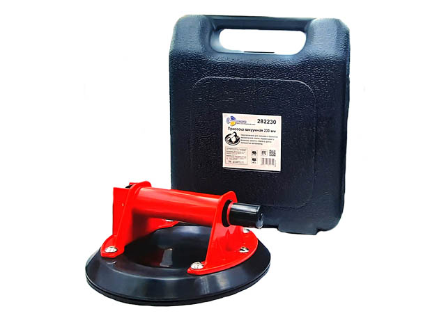 "Присоска вакуумная для плитки и стекла.Назначение: присоска вакуумная предназначена для переноски и подъема глянцевой или шероховатой керамической плитки, керамогранита, мрамора, гранита, стекла и других непористых материалов размером от 230 мм.Особенности: пластиковый корпус ручки, диаметр 8' (230 мм), рекомендованная нагрузка 68 кг, поставляется в кейсе."