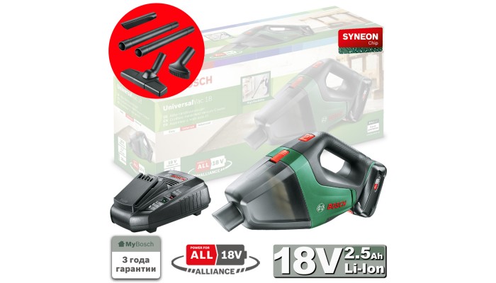 Аккум. пылесос BOSCH UniversalVac 18 в кор. + аксессуары (18.0 В, 1 акк., 2.5 А/ч, Li-Ion, 0.50 л, класс: L, самоочистка: нет)
