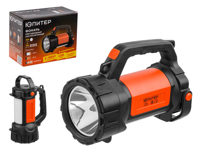 Фонарь светодиодный аккум. 3Вт+3Вт (оранж.) ЮПИТЕР (USB A - micro-USB кабель в комплекте)
