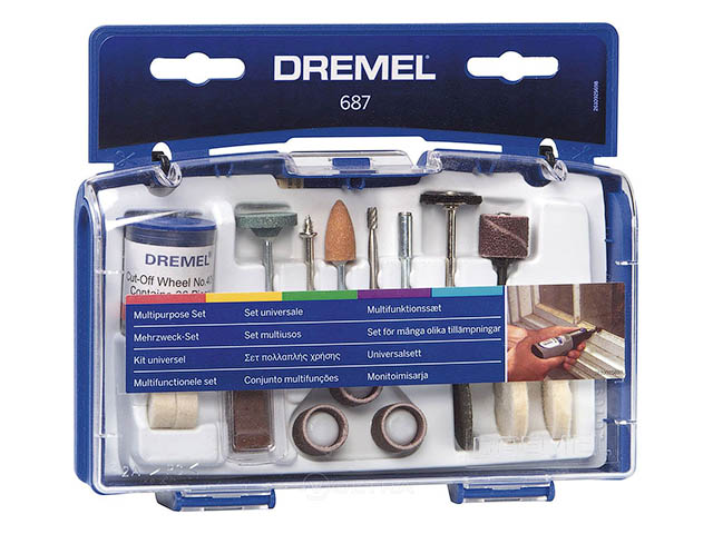 Набор оснастки Dremel 26150687JA содержит различные насадки для использования с граверами. Насадки применяются для обработки различных материалов.