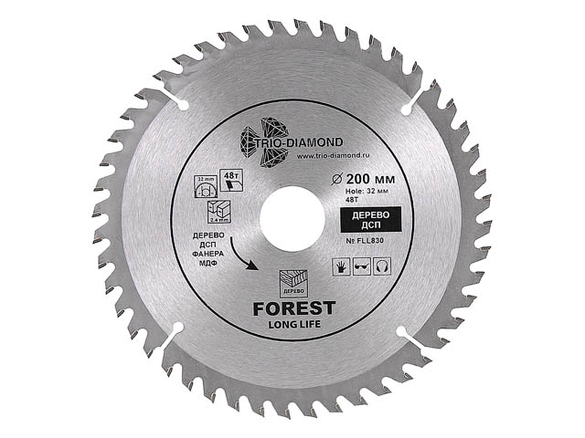 Диск пильный 200х32/30 мм 48 зубьев TRIO-DIAMOND Forest Long Life (FLL830) предназначен для распила древесины, ДСП, фанеры. Угол заточки 15 градусов. Максимальное число оборотов 7600 RPM.Тип диск пильныйДиаметр 200 ммКоличество зубьев 48 штШирина пропила (зуба) 2,4 ммФорма зуба ATBМаксимальное число оборотов 7600 об/минУгол наклона зубьев положительныйПередний угол 15 °Совместимость пила циркулярная, пила дисковая, пила торцовочная