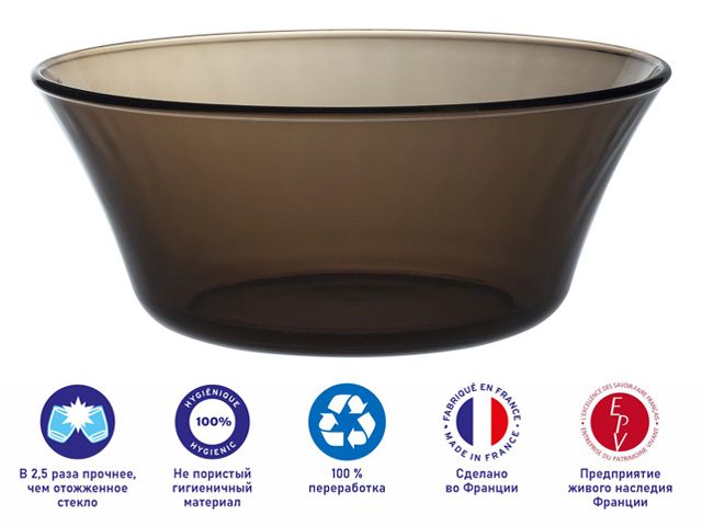 Салатник Lys из сверхпрочного закаленного стекла от ТМ Duralex - надежный помощник в приготовлении любимых рецептов. Классический темный цвет стекла придаст изысканный вид сервировке стола. Ударопрочное стекло обеспечивает привлекательный внешний вид и устойчиво к появлению царапин. Салатники компактны в хранении и экономят место на кухне, ведь их удобно штабелировать. Стеклянная посуда ТМ Duralex производится во Франции с 1945 года. Процесс закаливания придает стеклу ТМ Duralex особую прочность. Во время закаливания стекло ТМ Duralex , предварительно нагретое до 700°С, подвергается резкому охлаждению холодным воздухом. Этот процесс делает стекло ТМ Duralex в 2,5 раза более устойчивым к механическим повреждениям, чем отожженное стекло. Характеристики: ударопрочное закаленное стекло, термостойкость до 130 ° C (EN 1183), можно мыть в посудомоечной машине, подходит для использования в микроволновой печи.