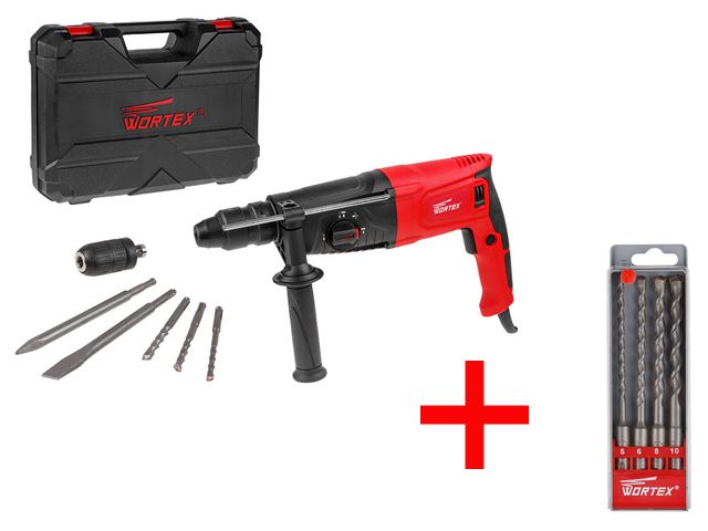 Перфоратор WORTEX RH 2629 в чем. + (2 зубила, 3 сверла) + АКЦИЯ!(буры в подарок) (+ Набор буров (сверл) SDS-plus 4 шт. WORTEX в ПОДАРОК!)