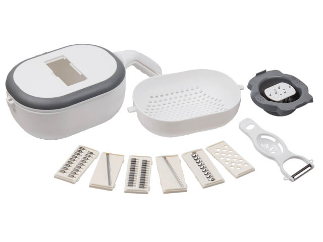 Многофункциональная овощерезка, изготовленная из высокопрочного пластика, имеет большое количество насадок с лезвиями из нержавеющей стали.