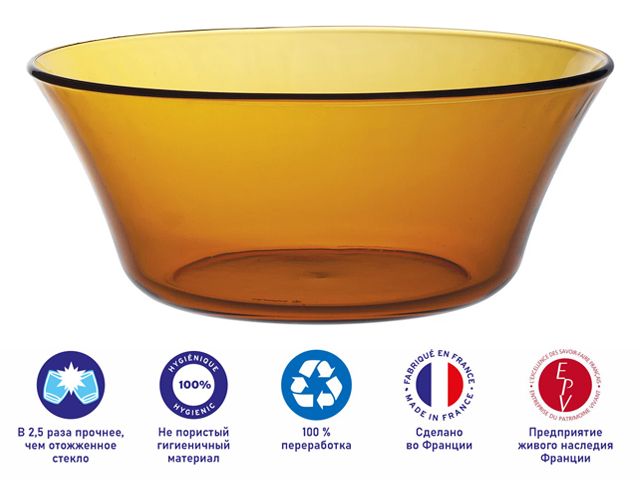 Салатник Lys из сверхпрочного закаленного стекла от ТМ Duralex - надежный помощник в приготовлении любимых рецептов. Благородный янтарный цвет стекла добавит изюминку и оригинальность сервировке. Ударопрочное стекло обеспечивает привлекательный внешний вид и устойчиво к появлению царапин. Салатники компактны в хранении и экономят место на кухне, ведь их удобно штабелировать. Стеклянная посуда ТМ Duralex производится во Франции с 1945 года. Процесс закаливания придает стеклу ТМ Duralex особую прочность. Во время закаливания стекло ТМ Duralex , предварительно нагретое до 700°С, подвергается резкому охлаждению холодным воздухом. Этот процесс делает стекло ТМ Duralex в 2,5 раза более устойчивым к механическим повреждениям, чем отожженное стекло. Характеристики: ударопрочное закаленное стекло, термостойкость до 130 ° C (EN 1183), можно мыть в посудомоечной машине, подходит для использования в микроволновой печи.