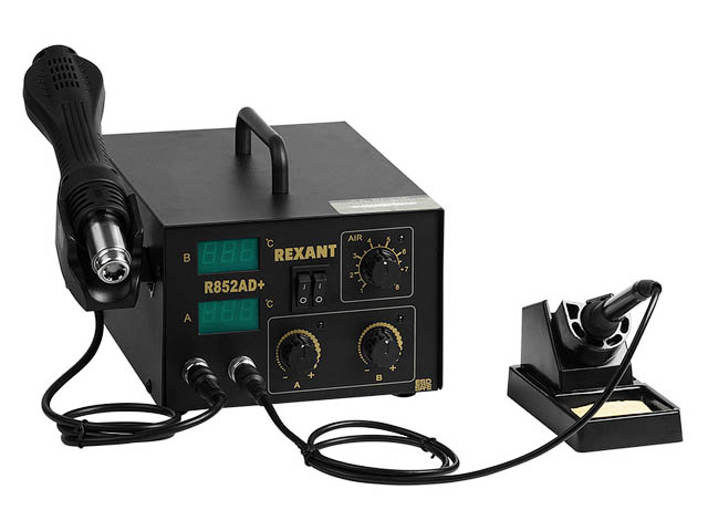 Универсальная цифровая паяльная станция 2 в 1 с компрессорным феном и паяльником (R852AD+) применяется для демонтажа или пайки различных видов компонентов, таких как SOIC, PLCC, QFP, BGA и т. д.