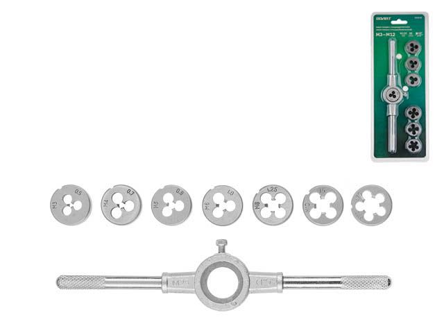 плашки: 7 шт. М3 x 0,5 мм, М4 x 0,7 мм, М5 x 0,8 мм, М6 x 1 мм, М8 x 1,25 мм, М10 x 1,5 мм, М12 x 1,75 мм;