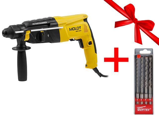 Перфоратор MOLOT MRH 2629 в чем. + (2 зубила, 3 сверла)+ АКЦИЯ! Набор буров в подарок! (Набор буров (сверл) SDS-plus 4 шт. WORTEX в подарок!)