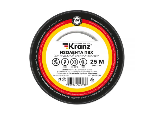 Изолента ПВХ KRANZ 0.13х19 мм, 25 м, черная