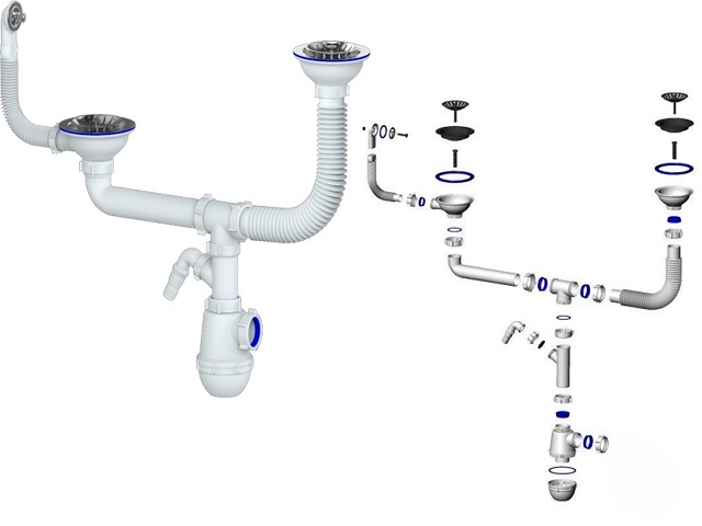 Сифон для кухни с круглым переливом, двойной, с выпусками 1 1/2" (40мм), Unicorn