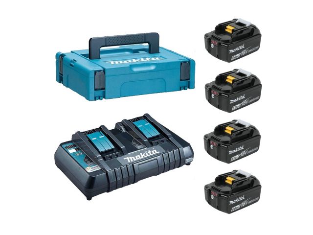 Набор Makita состоит из четырех аккумуляторных батарей BL1860B и зарядного устройства DC18RD. В комплектацию входит также практичный пластиковый систейнер типа MakPac.