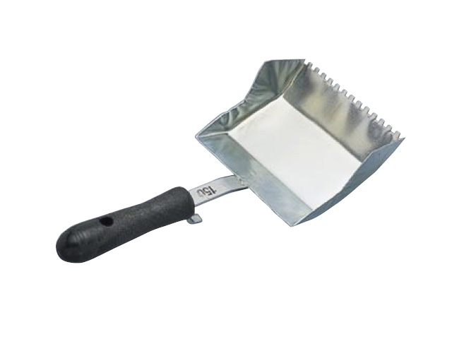 Зубчатая кельма для укладки раствора на газосиликат. Цельногнутый стальной ковш. Отсутствуют сварные швы. Пластиковая рукоятка и скоба для подвеса на ёмкость с раствором.