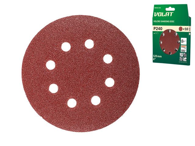 Шлифлист 125мм круг Р240 д/дерева 8 отв. 10шт. ВОЛАТ (круг абразивный шлифовальный перфорированный)
