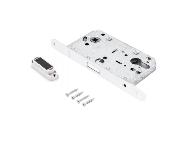 Универсальный магнитный врезной замок для установки на деревянные межкомнатные двери. Материал - сталь, полимерное покрытие. Удаление ключевого отверстия - 50 мм. Межосевое расстояние - 85 мм. Овальная торцевая планка. Ширина планки - 18мм. Габариты корпуса - 132х74х15 мм. Засов из ударопрочного пластика. Цилиндровый механизм в комплект не входит.
