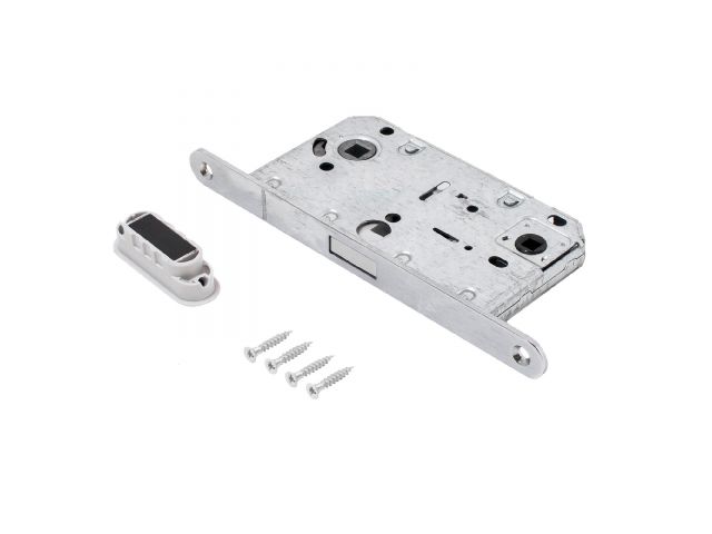 Универсальная магнитная защёлка врезная для установки на деревянные межкомнатные двери. Материал - сталь, гальваническое покрытие.Под ручку с квадратом 8 мм и сантехническую завертку с квадратом 6 мм. Удаление ключевого отверстия - 50 мм. Межосевое расстояние - 96 мм. Овальная торцевая планка для возможности установки с помощью автоматического инструмента. Ширина планки - 18мм. Габариты корпуса - 132х74х15 мм. Засов из ударопрочного пластика.
