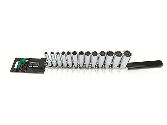 "Набор головок 3/8"" TOPTUL включает в себя 13 глубоких 12-гранных головок (7-21 мм), изготовленных из хром ванадия. Используется при работе с крепежом на высоких шпильках и резьбовыми деталями удлиненной формы. Рекомендуется для профессионального использования.