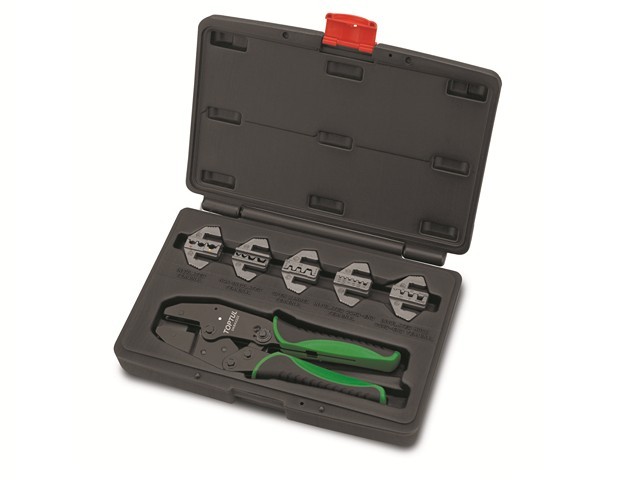 Набор для обжимки клемм TOPTUL состоит из щипцов и 5 сменных насадок и упакован в ударопрочный кейс размером 280х195х50 мм.