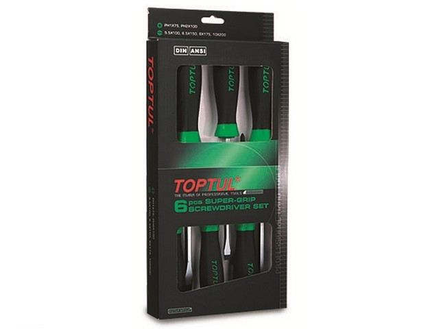 "Набор отверток TOPTUL 6 предметов (GAAE0608) используется квалифицированными специалистами различных сфер промышленности. Цельнозакаленный стержень отверток изготовлен из конструкционной легированной стали и оснащен магнитным наконечником. Двухкомпонентная рукоятка: термопластичный каучук и полипропилена гарантирует удобство в работе и предотвращает проскальзывание инструмента в руке. Набор включает 4 плоскошлицевых отвертки и две с шлицем РН.